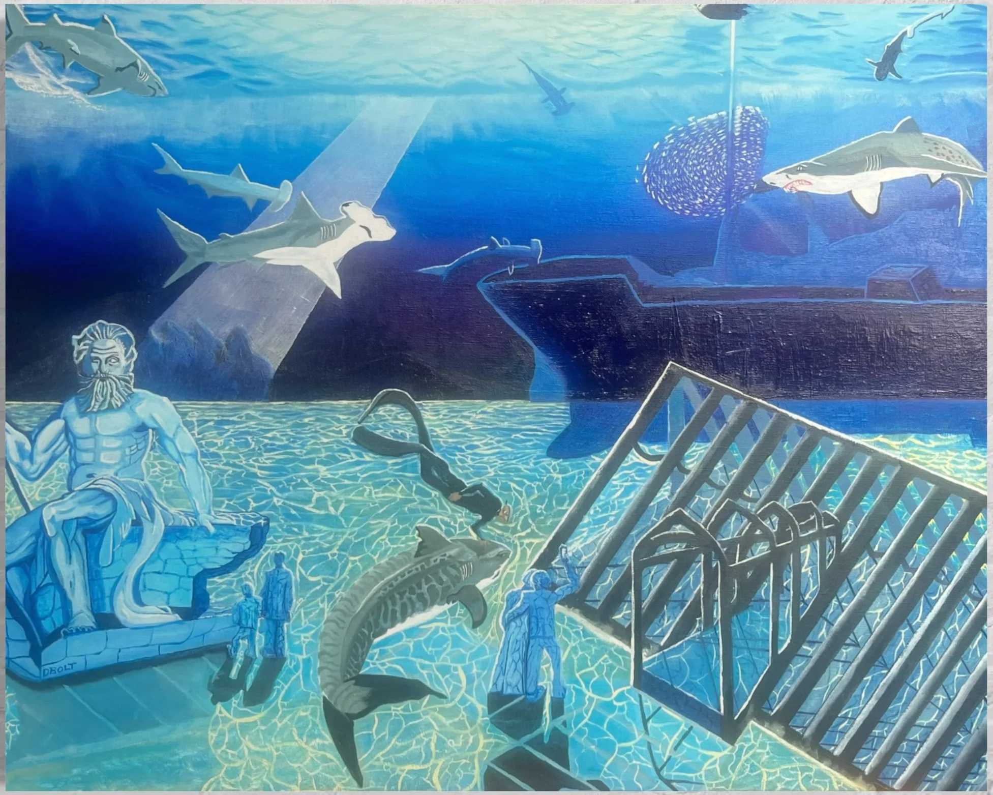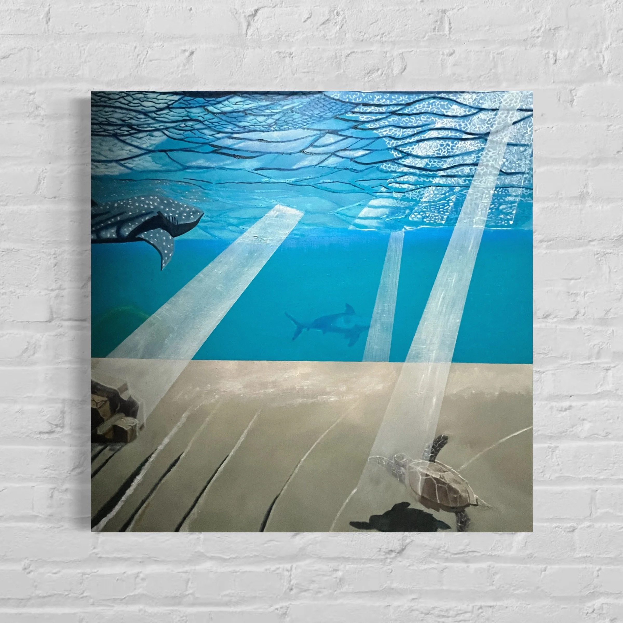 Beyond the immediate visual seduction — the way light fractures and recombines beneath waves, the palette of deep ultramarines and sudden phosphorescent flashes — the work functions as a moral landscape. Each brushstroke suggests not only a shape or motion but a ledger of consequences: currents that ferry life and plastic alike, shoals that once teemed with abundance now rendered skeletal by overfishing, coral ridges painted in colors so vivid they almost ache because one knows many real corals are bleaching into ghostly paleness. The painting’s textured surfaces insist on tactility; they call to mind the roughness of barnacle-encrusted hulls, the sleek sheen of a sharks flank, the abrasive scrape of sand on fins. Those textures are a tactile memory of what is being lost and what remains to be preserved.