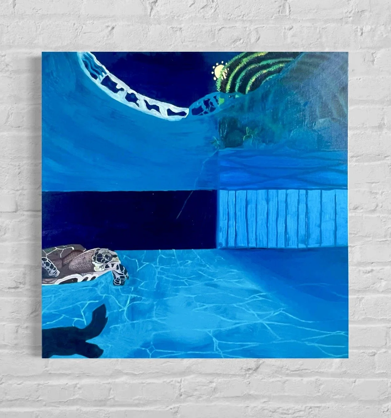This painting explores the reunion of old friends who gather after time spent apart, each carrying new experiences and unfamiliar chapters. The silhouetted white pointer shark serves as a central symbol: at once an intruder and an emblem, it embodies the uncanny presence of change — sleek, purposeful, and unknowable beneath a placid surface. Its blank, pale form suggests both memory and blank pages: traces of what once was, and the unread possibilities that now swim between them.