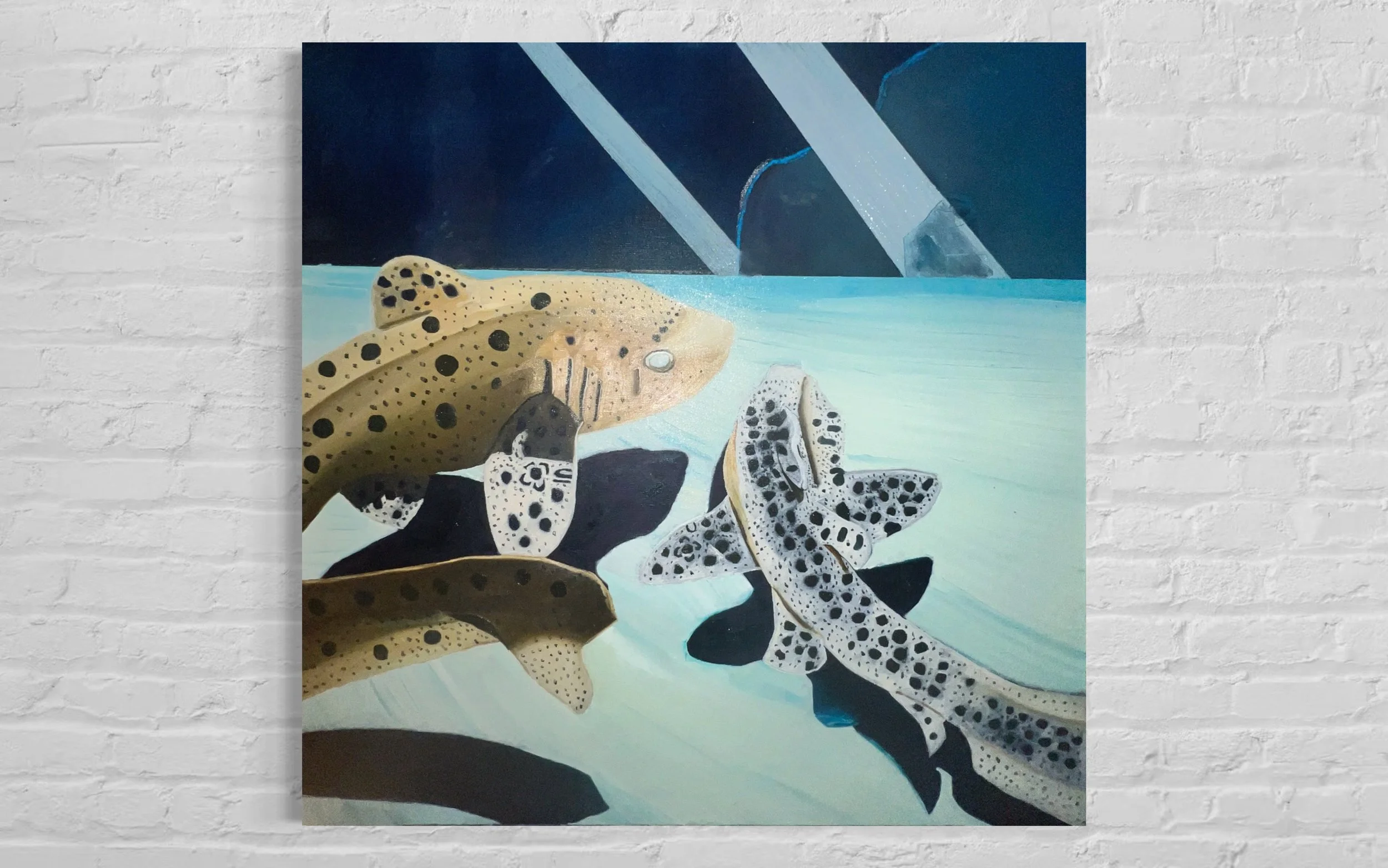 In this painting I examine the subtle, layered dynamics of motherhood through the emblem of the leopard shark. Though these sharks do not tend their young after hatching, they instinctively deposit their eggs in sheltered, secure sites. I have extended that natural behavior into a hypothetical gesture: the imagined “mother shark” who, without direct caregiving, guides the next generation to appropriate places for laying eggs—transmitting practical knowledge rather than providing continual nurture. The work considers maternal strength as quiet and measured, a protective instinct expressed through foresight and placement rather than immediacy. It evokes a lineage of tacit wisdom, a restrained but potent inheritance that readies successors for survival from afar.