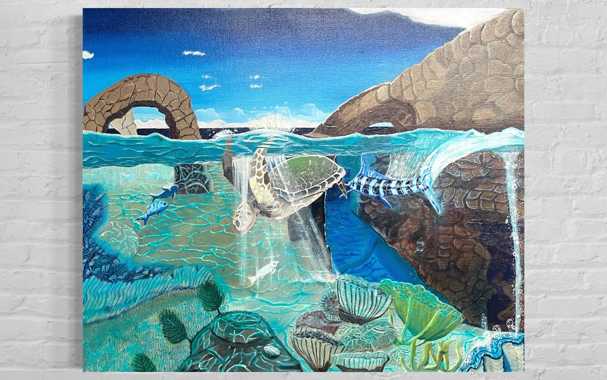 This painting explores the varied rhythms and lifestyles of marine life, offering a closer look at the different paces and patterns that define underwater existence. It contrasts swift species such as the marlin with slower-moving inhabitants like the green sea turtle, highlighting the diversity of movement, feeding habits, and survival strategies that coexist within the ocean ecosystem.